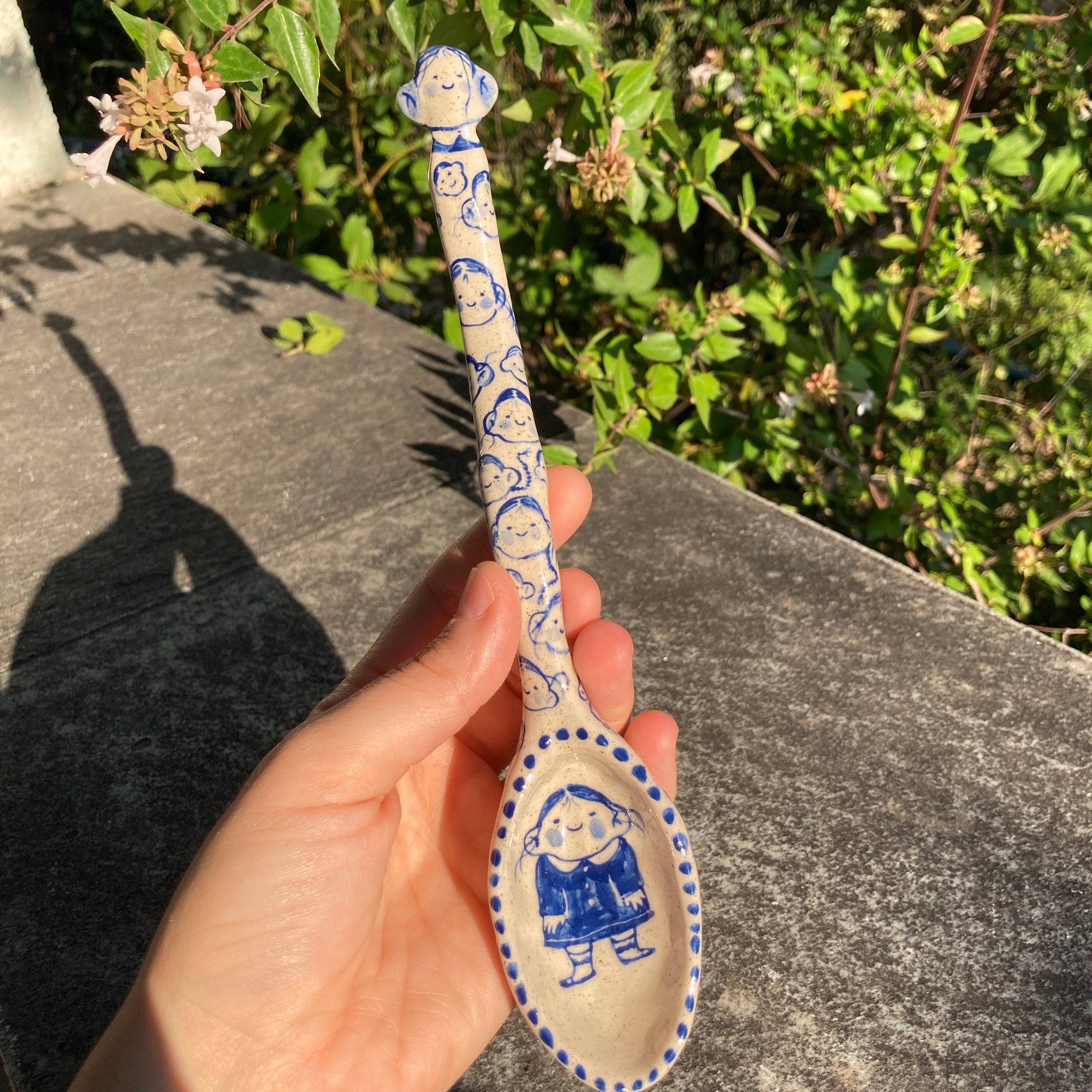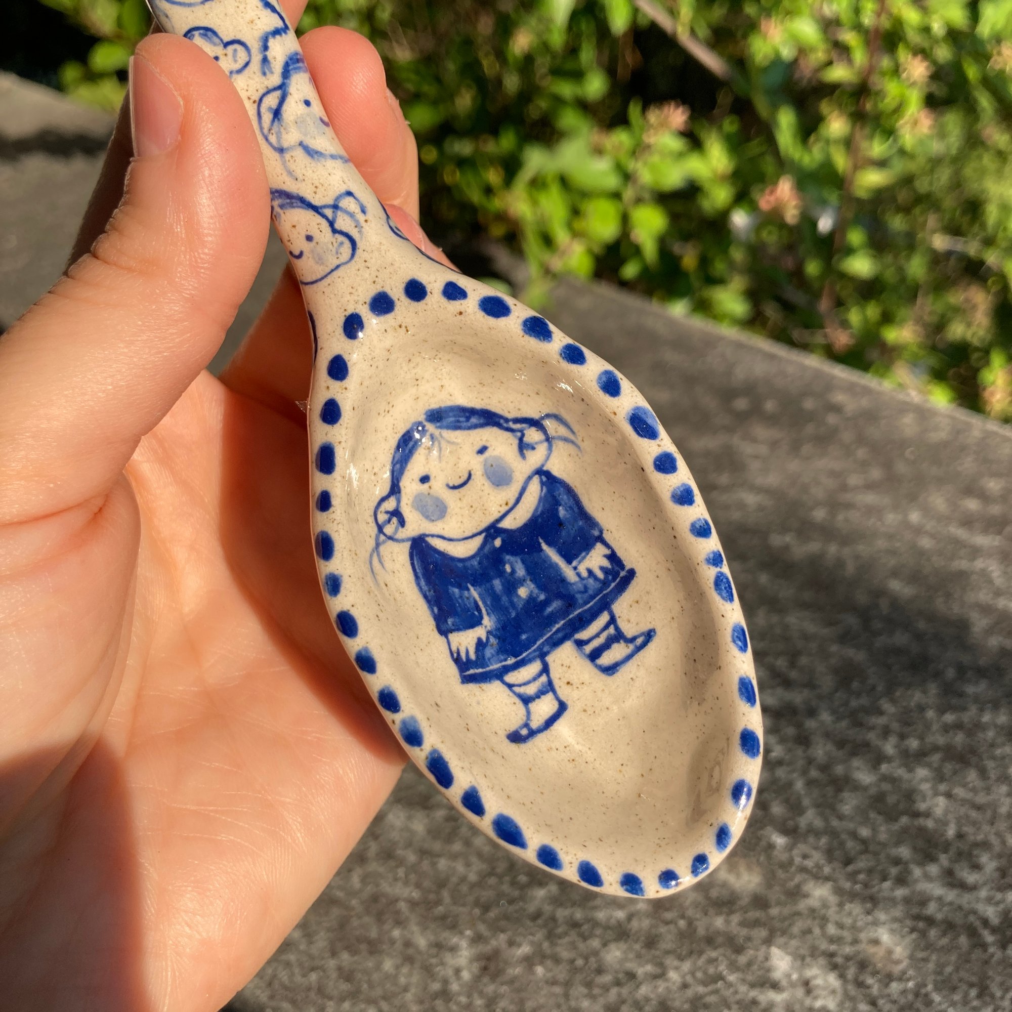 An adorable, hand painted ceramic spoon. Good for dips, sauces, sugar, yogurt and jams. Food safe for hot and cold items!
