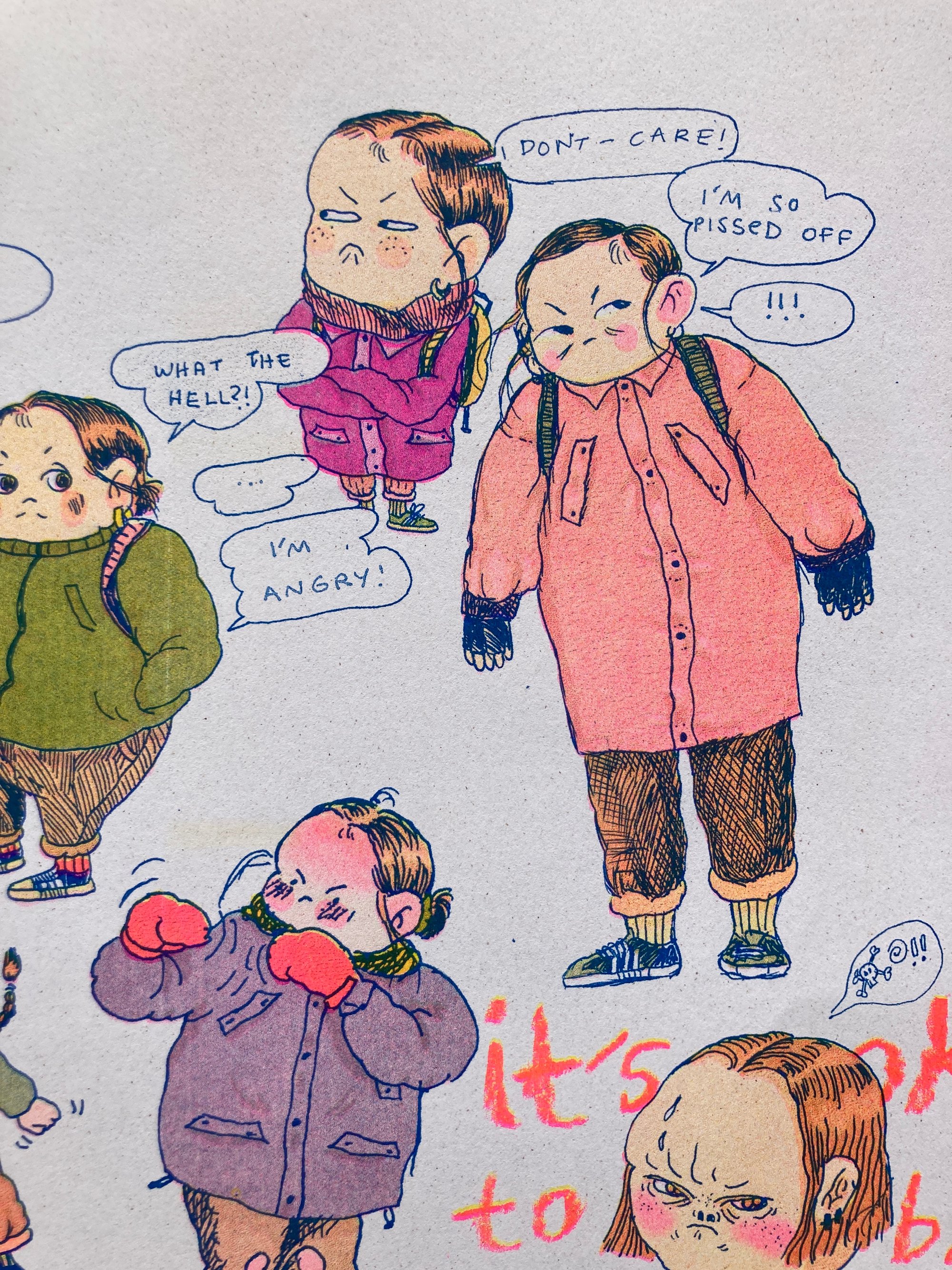 This Risograph print, is printed with Yellow, Fluor Pink, Aqua and Black ink on 120gr Crush Citrus recycled paper.